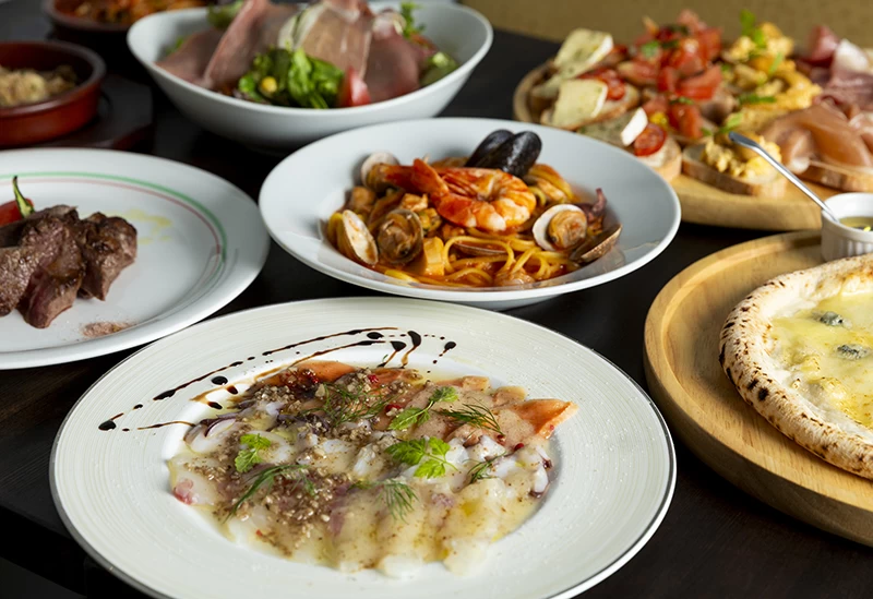 手の込んだパエリアや肉料理など、充実のラインアップでメニュー選びから楽しくなる本格イタリアン。冷菜や温菜、パスタやピザなどのアラカルトメニューも種類豊富です。なかでも、シェフが選び抜いたもちもち食感の生パスタが人気で、本場の味を気軽に楽しめます。また、ランチメニューも見逃せません。パスタまたはピザが選べる「ランチセット」や、前菜付きのコースもあるので、ランチデートに立ち寄ってみてはいかがでしょうか。