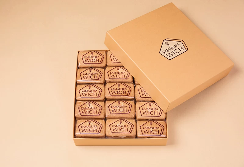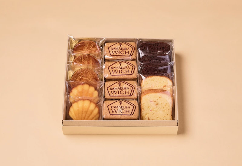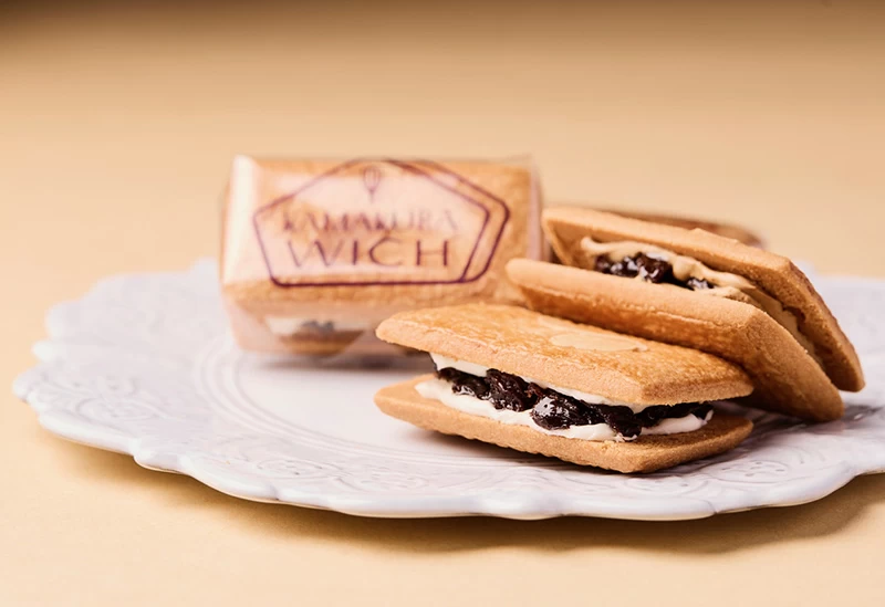 鎌倉駅の西側、御成通りにたたずむ洋菓子の名店。「KAMAKURA WICH(ラムレーズン)」は、芳醇なラム酒にじっくり漬け込まれた大粒レーズンと、上品な甘さのバタークリーム、サクサクとしたバターサブレの調和が絶妙な逸品です。また、パイやブラウニーなどの焼き菓子やプリンも販売されており、贈りものにもぴったり。店舗奥には喫茶スペースも設けられており、美味しいお菓子をいただきながらゆったりとしたカフェタイムを過ごせるでしょう。