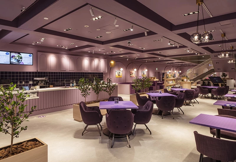 阪急烏丸駅から程近い「WAKASA&Co. 京都四条店」は、鮮やかな紫で統一されたポップな空間が魅力のカフェ。ランチタイムには、北欧の定番朝食「オーバーナイトオーツ」や、ブルーベリーをたっぷり使ったベーグルサンドなど、彩り豊かなメニューが楽しめます。1階のカフェは明るく開放的でゆったり過ごせ、写真映えも抜群。2階ラウンジでは、京都府産ブルーベリーを使ったクラフトジンや、ブルーベリー尽くしのアフタヌーンティーも堪能可能。ランチやカフェタイムにおすすめの、おしゃれで居心地の良い一軒です。