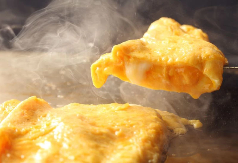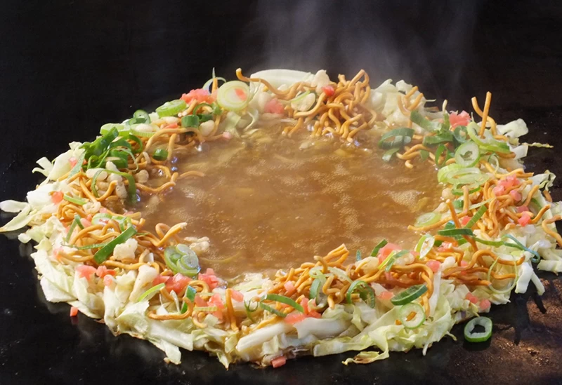 「広島焼き」の最大の特徴は、ミルフィーユ状の“重ね焼き”。中華そばを使用するのも大きな特徴です。小麦粉を水で溶いたゆるめの生地を鉄板に薄く丸く広げ、その上に千切りキャベツ、豚肉、もやし、天かすなどの具材を重ね、ひっくり返して蒸し焼きに。その後、隣で焼いた中華そばの上に乗せ、さらに焼いた卵の上に重ね、最後に卵が一番上になるようにひっくり返して仕上げます。本場では甘めのソースをたっぷりかけ、マヨネーズを使用しないのが一般的です。