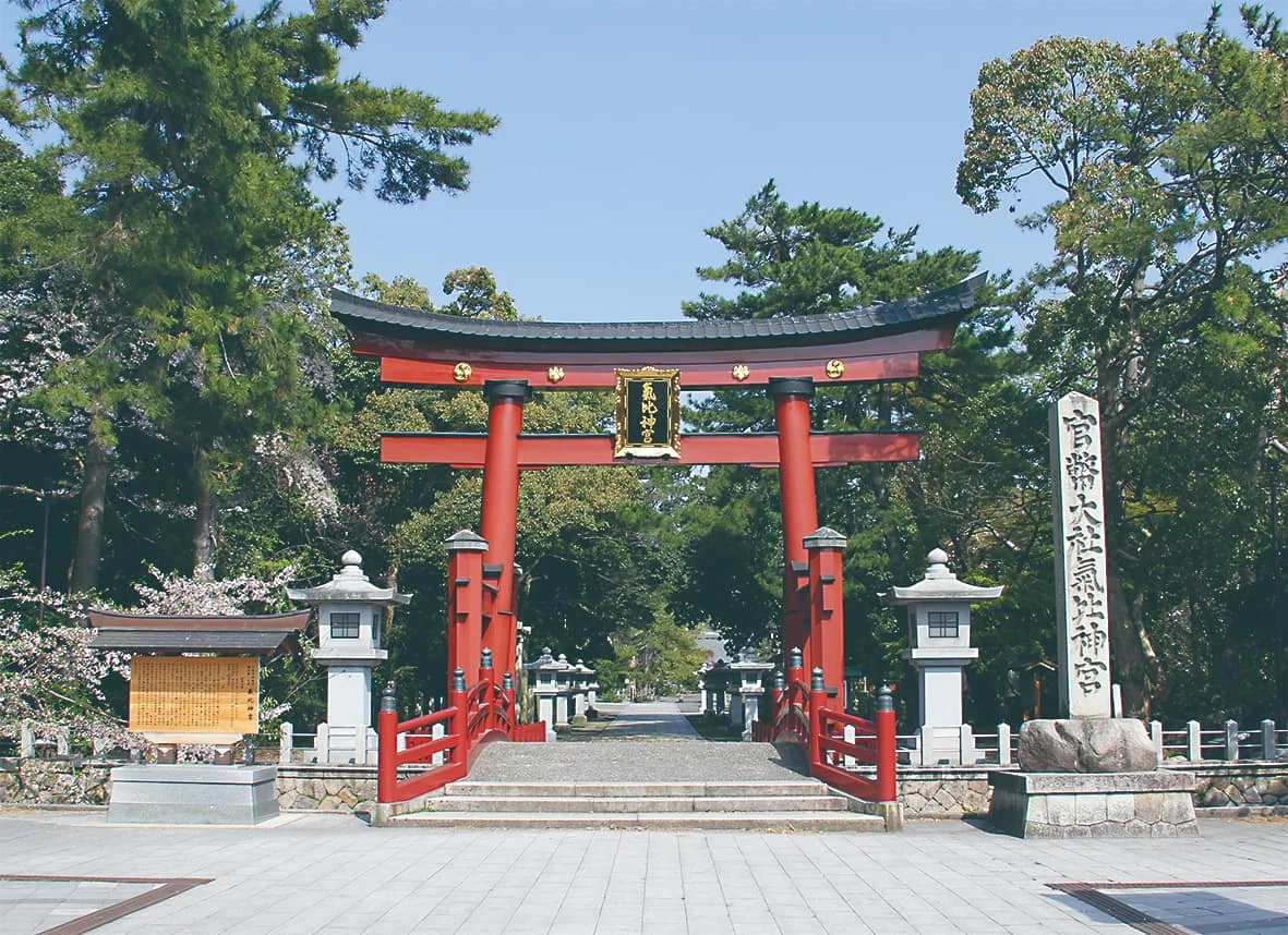敦賀駅西口より徒歩約15分の場所にある北陸総鎮守、越前国一之宮の威厳漂う神社。奈良の春日大社、広島の嚴島神社と並ぶ日本三大木造鳥居のひとつにもなっている空襲の戦火を逃れた縁起の良い木造の大鳥居が圧倒的な存在感を放っています。社務所向かいにある長命水は人気のパワースポットになっており、境内には松尾芭蕉が詠んだ5句の刻まれた石碑も設置されています。