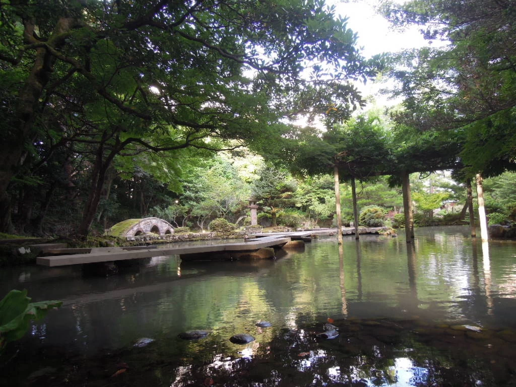 加賀藩の藩祖前田利家公と正室のお松の方を御祭神として祀る神社。国の重要文化財になっている和洋漢の建築様式の神門はおすすめのフォトスポット。神門の最上階にはめ込まれたギヤマンは美しく、夜間はライトアップされた幻想的な雰囲気も楽しめます。