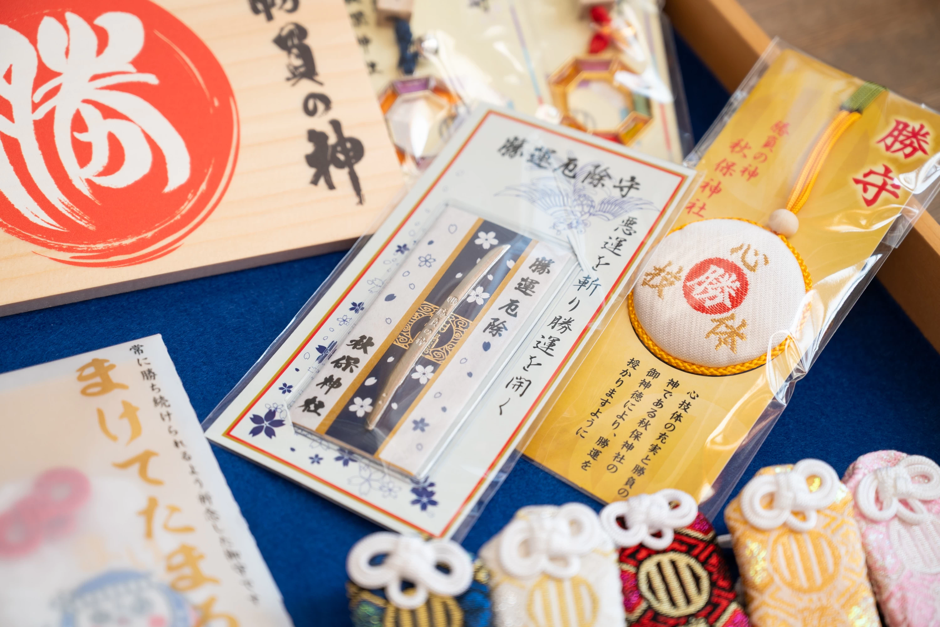 “勝負の神様”として有名な秋保神社の授与品には、「勝守」「新勝守」「勝絵馬」「勝運厄除守」「まけてたまるか守」「仕事開運御守」といった、勝負に特化したものが多数揃っている。また、勝負の神・家内安全・商売繁盛の3種類が揃う「祈祷木札」や「祈祷紙札」、「開運肌守」「厄除肌守」「交通安全御守」「無病息災瓢箪守」「病気平癒御守」「ぼけ封じ成す御守」「安産守」「こども守」「学業成就御守」「ペット愛護守」「うまくいく御守」「良縁桜咲く鈴音守」など、身に付けていつでも神様とつながることのできるお守りがたくさん用意されているので、それぞれに必要なお守りを拝受しよう。そのほか御神徳が込められた破魔矢やお札など多彩な授与品があり、願いを託す絵馬が神前に奉納できる。心を奮い立たせる力をいただき勝利を願おう。