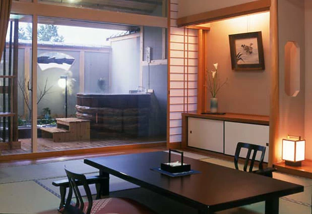 美肌効果が期待できる自家源泉の湯は、露天風呂付きの和室でもお楽しみいただけます。好きなときに好きなだけ、人目を気にせず湯に浸かるひととき。大切な方とゆったりとお過ごしください。