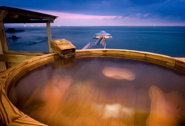 白浜の街と海を望む客室の源泉掛け流し露天風呂で、好きな時間に好きなだけ湯汲みをお愉しみください。全棟でNetflixが視聴可能、美顔器のようなシャワーヘッド「ミラブル」を設置していたりと、ゴージャスなポイントがたくさんあります。