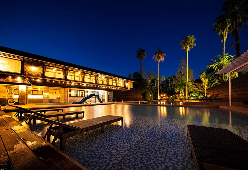 伊豆半島屈指のリゾート地・伊豆高原の高台から、相模灘や伊豆諸島を一望できる全室オーシャンビューの眺望が魅力。男女入替制の2つの大浴場は、それぞれに違った情緒が楽しめます。眼前に広がる大海原と伊豆諸島をはじめ、晴れた夜には満天の星を眺めながら湯浴みを満喫できる開放的な「満天の湯」は円形露天風呂。「月光の湯」には大浴場に内湯、寝湯、スチームサウナと、夜空に広がる星空を眺められる露天風呂も。天井走行リフトを完備した貸切露天風呂は前日までの予約が必要です。