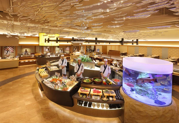 - ★ 富山湾直送の鮮魚をバイキングで愉しめるホテルです。毎晩のバイキング会場では常に鮮魚料理がズラリと並び、ゲストの目の前で調理するオープンキッチンスタイルなので、出来たて料理が取り揃います