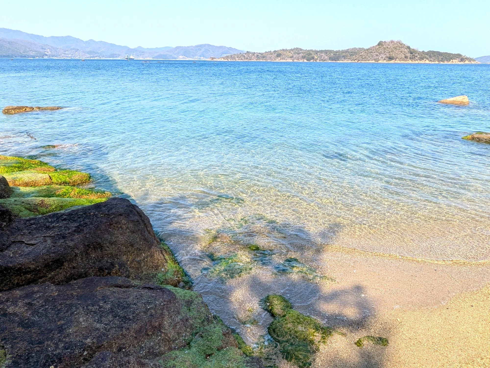 - ★ 透明度が高く、海のグラデーションが美しい小さな海岸。瀬戸内海に浮かぶ島々や、船が行き交う様子、釣りを楽しむ地元の人々の姿が見られる