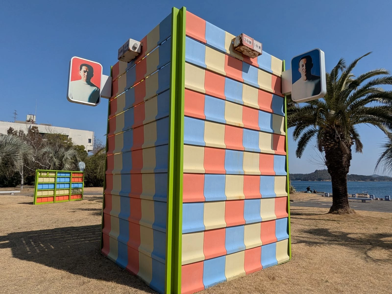 - ★ カラフルなブロックのように見えるのは、実はスタンドの椅子。「3分前/1分前」の競輪場のランプや、レジェンド競輪選手の肖像もアートの一部に!