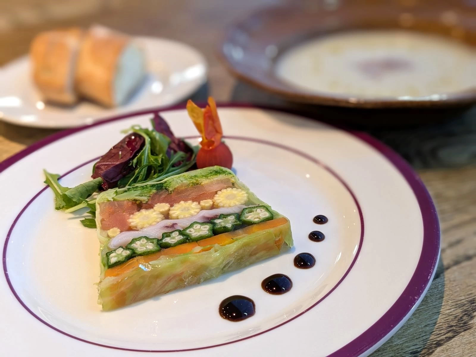 - ★ 春メニュー(竹プラン)は、春野菜とタコのテリーヌ、季節のポタージュ、岡山県産和牛もも肉のステーキ、ライス又はパン、春のスイーツ2種盛り、茶下山のお茶又はコーヒーと、盛りだくさん。瀬戸内の豊かな食を堪能できる内容になっています