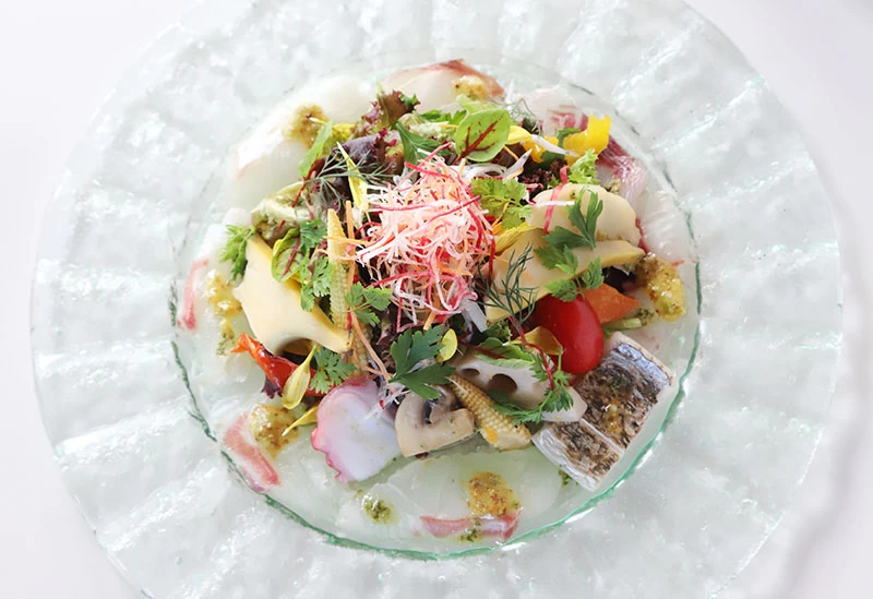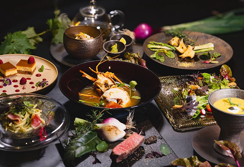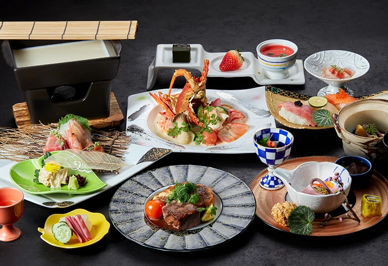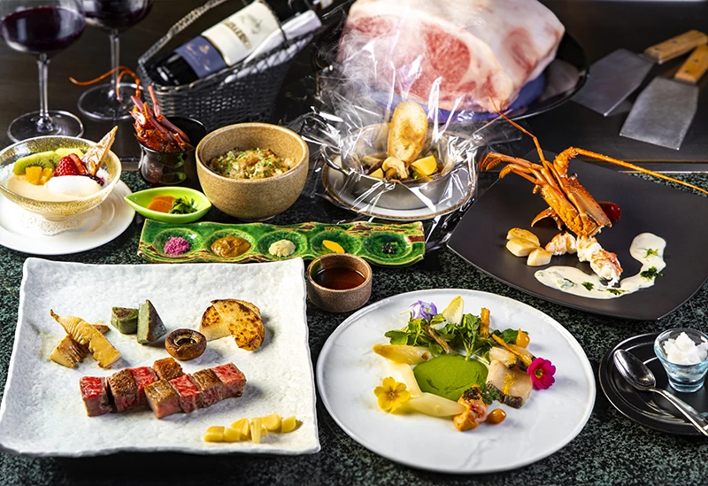 箱根・宮ノ下に佇む「箱根 吟遊」では、ロビーに足を踏み入れた瞬間、目の前に広がる絶景に心を奪われます。アジアンテイストと和の設えを融合させた館内は、モダンな意匠が随所に施され、上品で落ち着いた心地よさに満ちています。客室にはすべて露天風呂が備えられ、雄大な箱根の自然を眺めながら湯浴みを楽しめるのも魅力のひとつ。夕食には、相模湾でその朝に水揚げされた魚介や、旬の最もおいしい時期に収穫された野菜などを用いたオリジナルの会席料理をご用意。決まった献立はなく、その日その時の食材と向き合いながら、料理長が一皿ずつ創り上げる、唯一無二の味わいをご堪能いただけます。