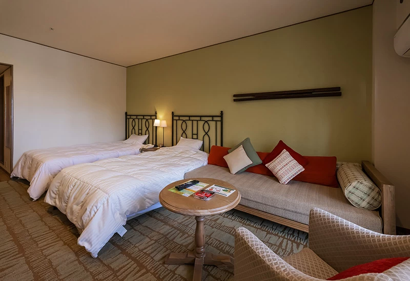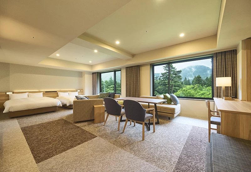 「草津温泉 ホテルヴィレッジ」は、1泊では足りないという声も多いアクティビティ充実の温泉リゾートです。客室は2〜5名に対応する多彩なタイプが揃い、グループや家族旅行にも利用しやすいのが魅力のひとつ。特にカップルには森林を望む「洋室 タワー館」が人気です。温泉は湯畑源泉を引く大浴場と露天風呂を備え、冬は雪見露天も愉しめます。夕食はブッフェのほか、フレンチや和食コースを用意。滞在スタイルに合わせて自由にチョイスできます。