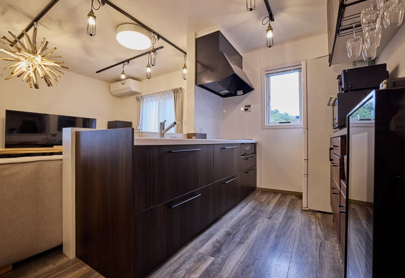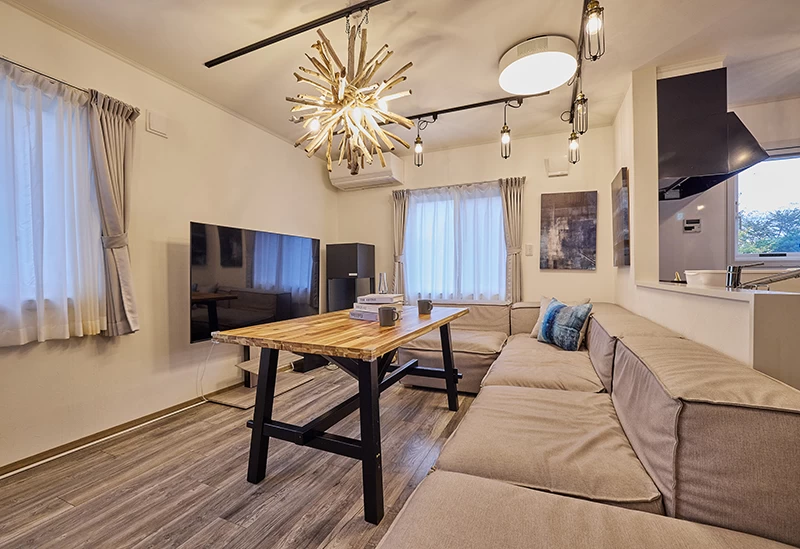一棟貸し宿「Villa Hanasaku 軽井沢御代田」は、プライベートな時間を存分に楽しみたい方におすすめ。リビングダイニングには大きなテーブルとソファーが備わり、ゆったりとだんらんの時間を過ごせます。開放感のあるシステムキッチンには炊飯器やフライパン、カトラリーまで揃い、食材を持ち込めば気軽に料理を楽しめます。水着で利用できるおひとり様用サウナや卓球、ボードゲームなども用意され、滞在時間を思い思いに満喫できます。