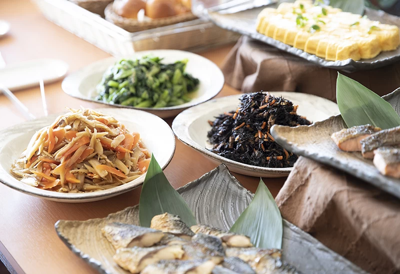 朝食は、添加物の少ない手作りの料理や京都のおばんざいが豊富に並び、月替わりのフェアメニューも楽しめます。